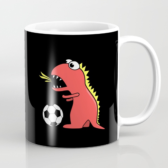 Black cartoon soccer dinosaur mug / Society6. Buy it here.