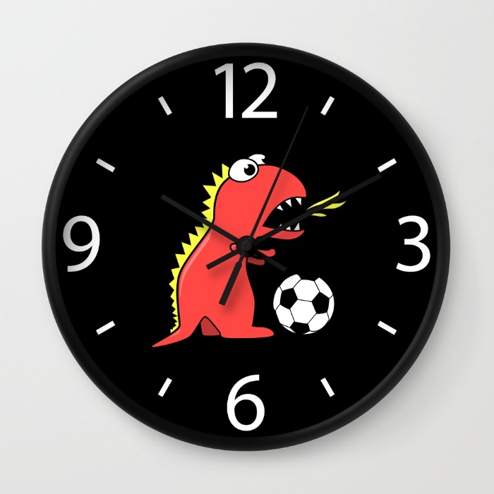 Black cartoon soccer dinosaur wall clock / Society6. Buy it here.