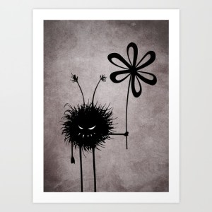 The Evil Flower Bug is a grinning cartoon evil character with sharp teeth holding a flower. It’s evil and kind of cute. It loves flowers… loves eating them, in fact. The bug is frequently found doing evil deeds, eating flowers and just having fun. This evil creature illustration has two variations. One features a dark textured grunge background and the other is in a vibrant red color. It reminds of gothic style and has a pinch of humor, too. This creatures is also perceived as cute by most of the people I know.