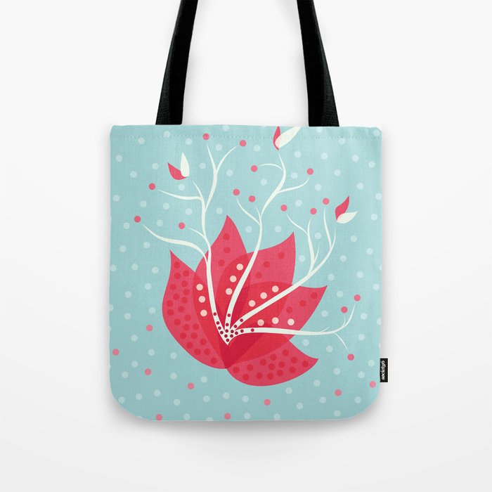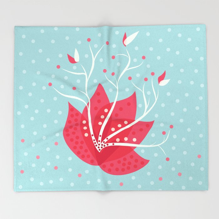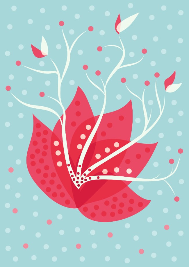 Abstract exotic flower which I drew after a sketch created in the Paper app on my phone. It’s a vector illustration of a pink flower with sharp petals and weird stamen ending in leaves over a light blue background with light blue and pink polka dots. Later created art prints and products with this elegant botanical design at my Redbubble and Society6 stores.