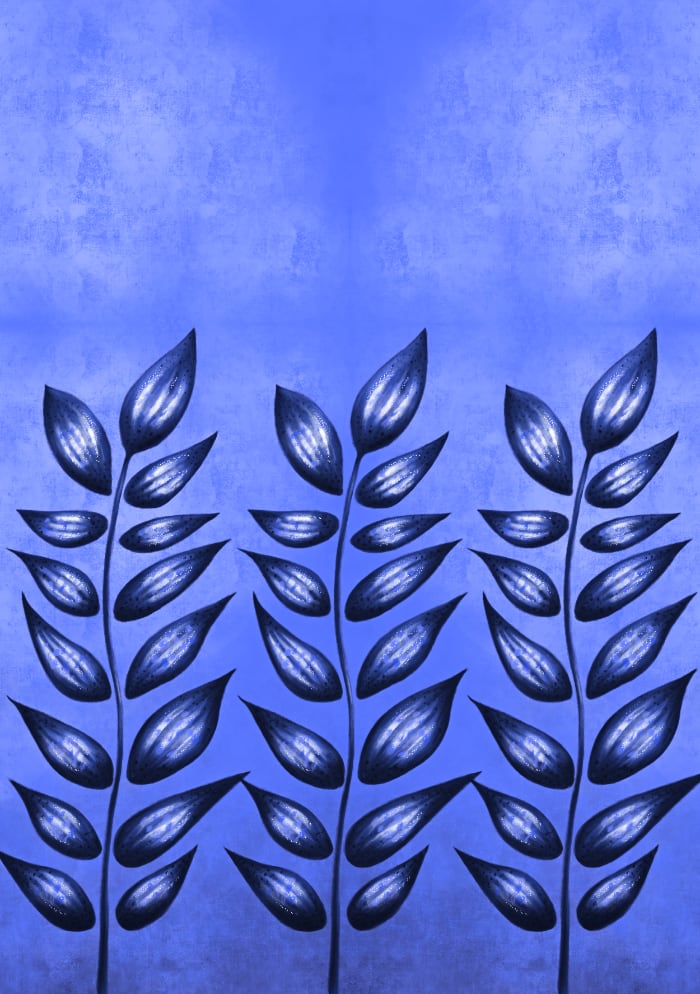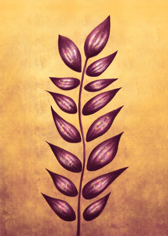 Abstract plant which I drew while doodling in Procreate some time ago. I love pointy shapes and sketched the flower quickly. Then tried some of the painterly brushes and this is the result. Also, created a pattern with this plant. There are two versions – the original on in purple and yellow and one with altered color in monochrome blue. Later I added art prints to my Redbubble and Society6 stores. Here they are: