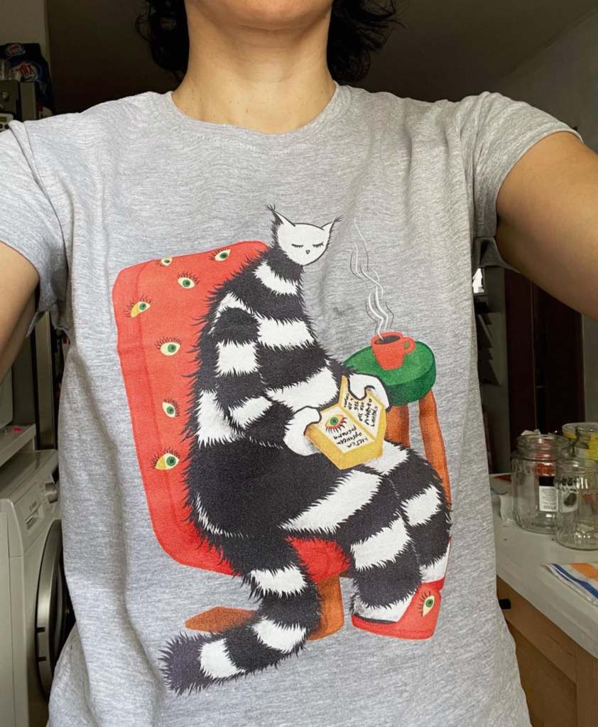 Cat book lover T-Shirt in real life from my Teepublic online store. I just had to buy it for myself. This is one of my favourite recent illustrations because it’s so “me”. Also, I chose Teepublic because they ship from Europe to Bulgaria, so no customs fee. I’m happy with it.