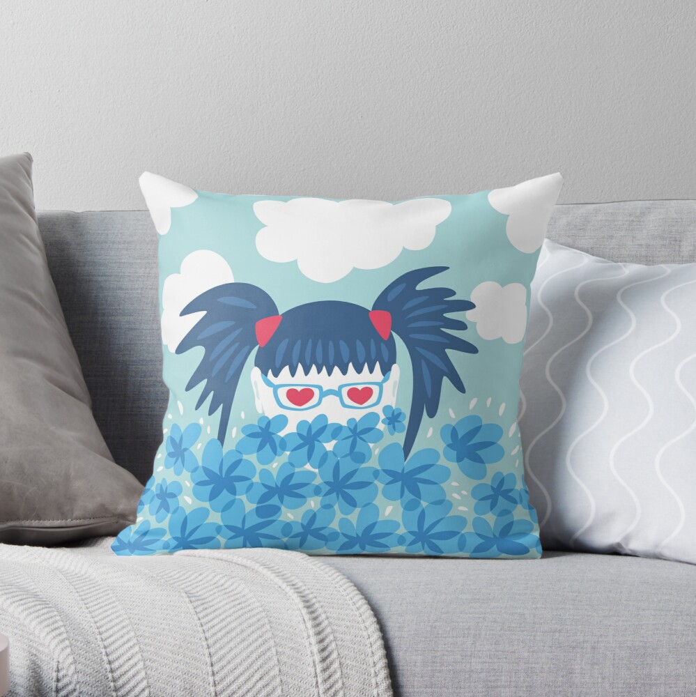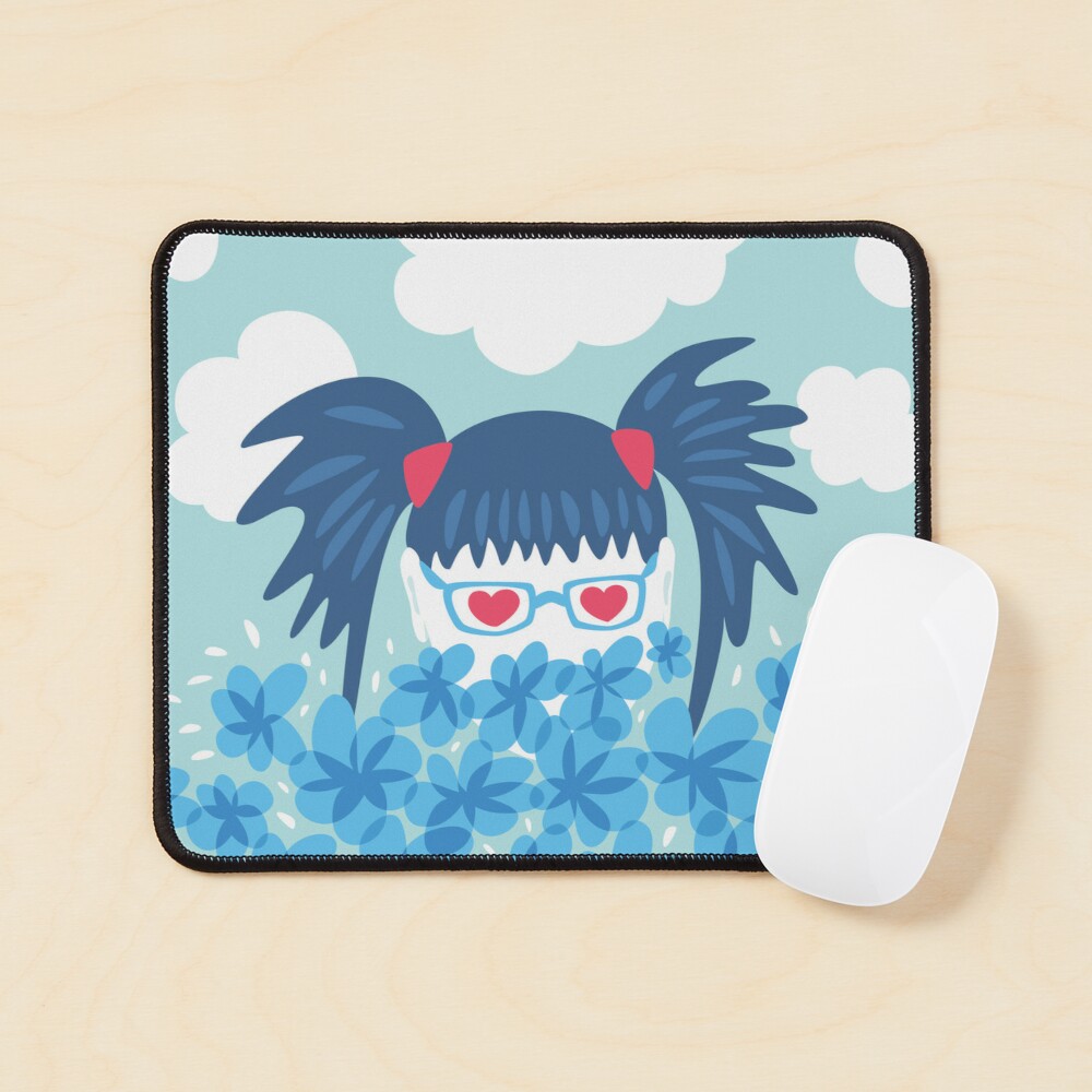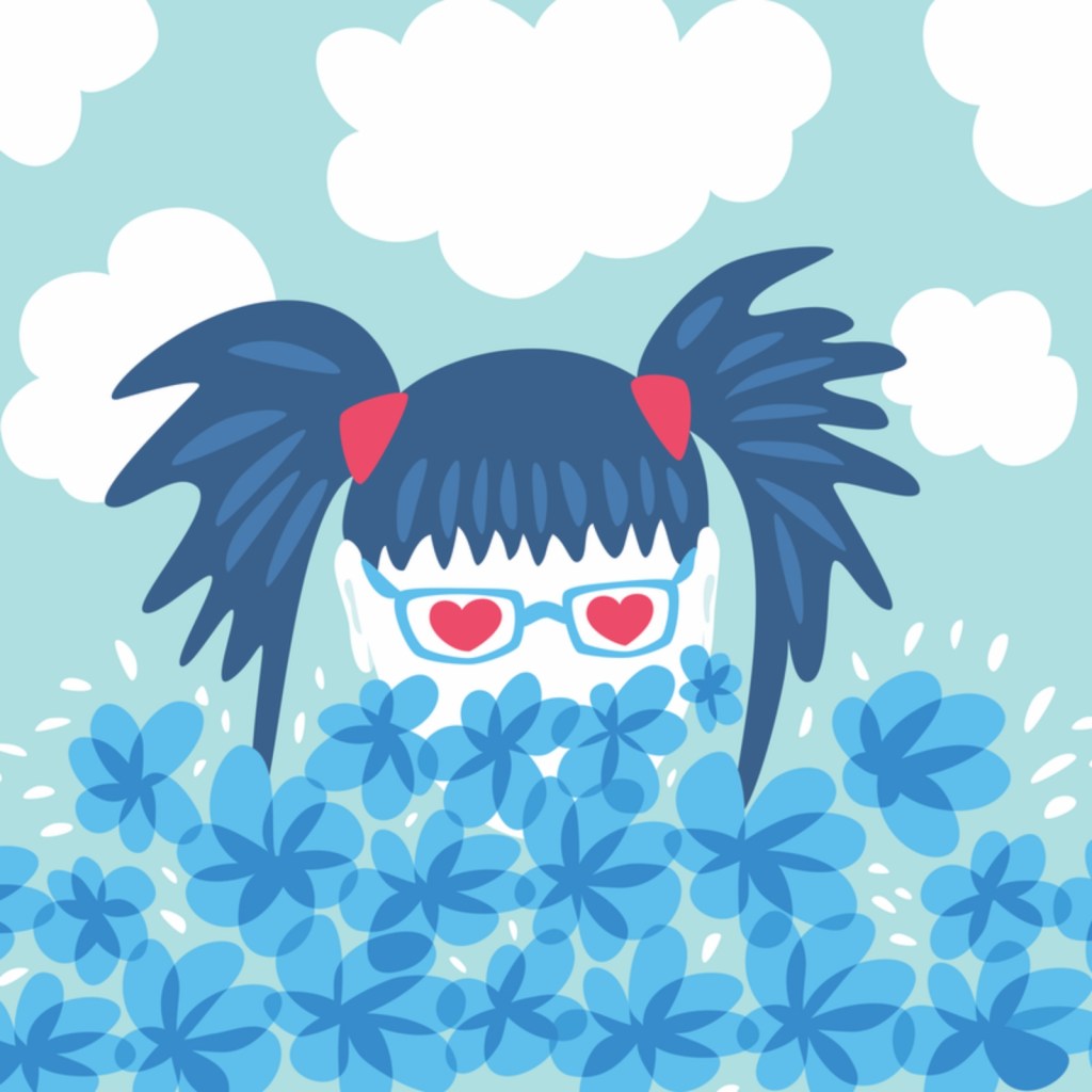 Geek girl funny illustration of a the face of a girl with blue hair in ponytails and heart shaped eyes behind blue eyeglasses, her mouth hidden behind a bunch of blue flowers. This nerdy design is available was art prints: