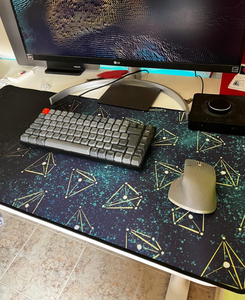 My husband wanted a desk mat with one of my designs – Space Galaxy Pyramid Constellations. He suggested to add a fading to dark in some way to make it more visually interesting. It was a good idea – I tried it and also liked it more this way, too. So now instead of the pattern only, here is the design customised by his request: