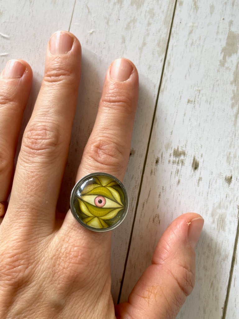 I print it, cut it and glue it with decoupage glue onto the glass. I came to the conclusion that I have to put a lot of glue and clean afterwards. Otherwise, when the glue is dry little shiny spots remain on the image which are seen when light is falling from some angles. Like in this necklace with my ferret illustration: