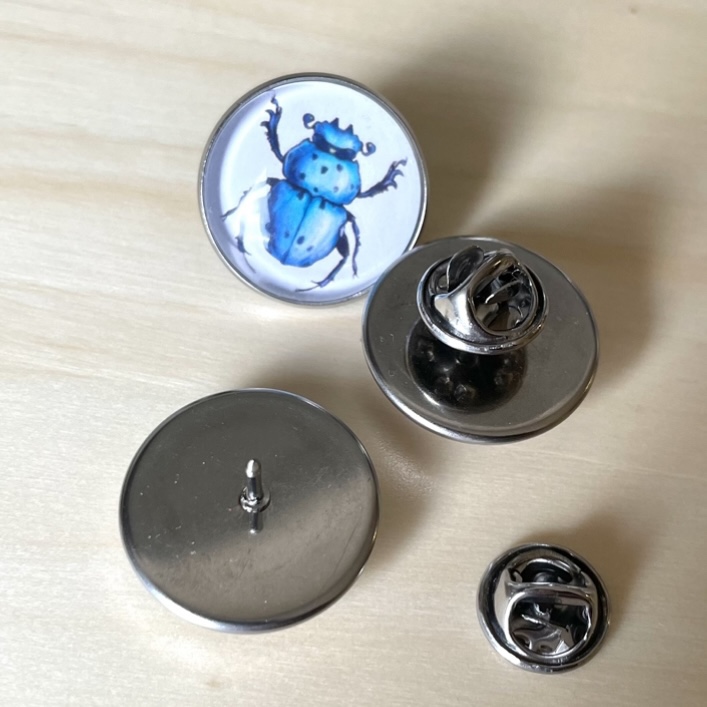 Тези значки с бръмбари са с размер 20 или 25 мм, което ги прави идеални за прикрепяне към раница, яке или блуза. Те са направени от неръждаема стомана и стъкло, който гарантира, че ще останат красиви за дълго време. Значките са лесни за прикрепване, благодарение на клипса или иглата на гърба им, която осигурява здраво закрепване.