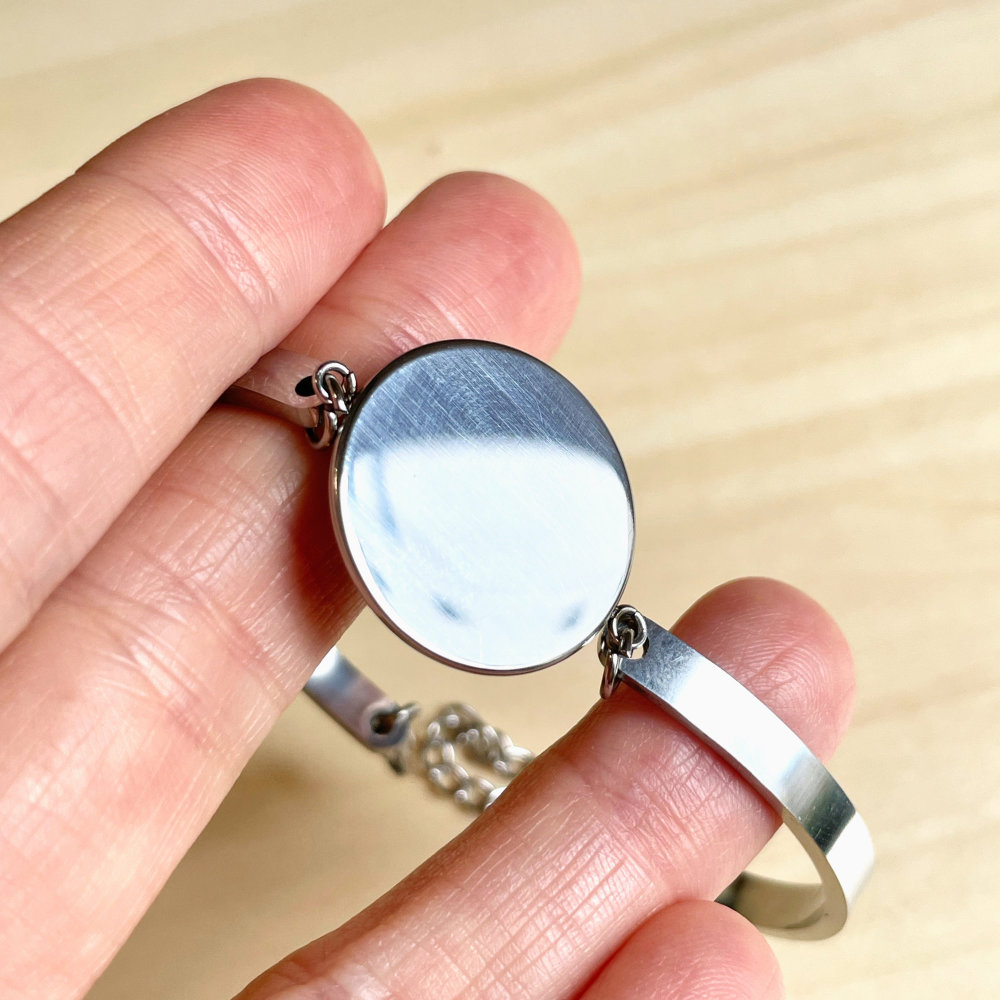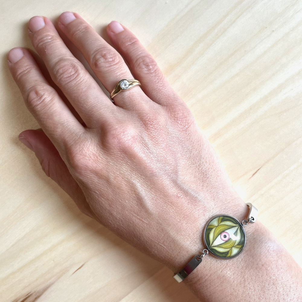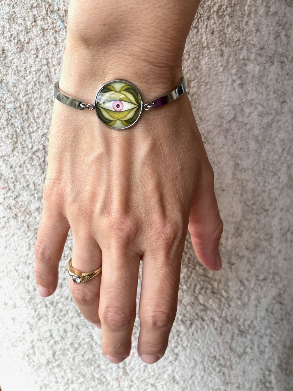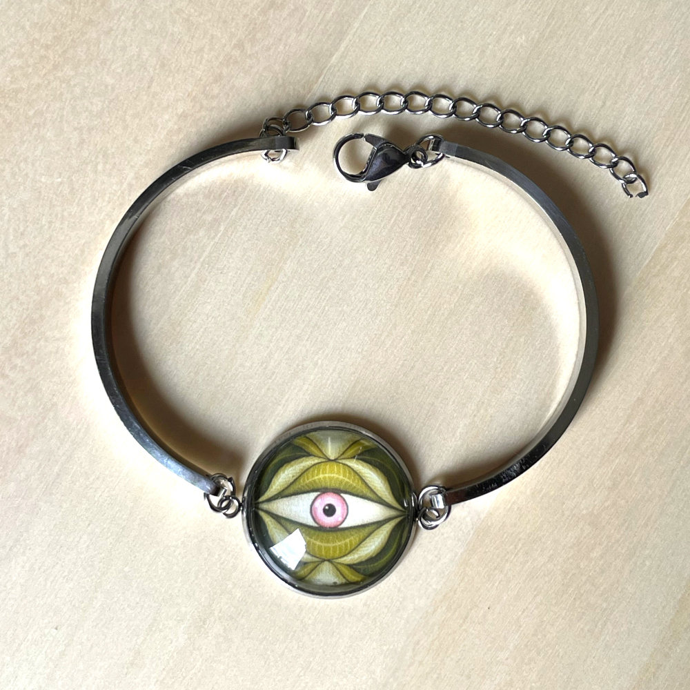 Introducing my latest creation: the Weird Eye Bracelet. This quirky piece of jewelry features a stainless steel band with a cabochon with my artwork of a pink eye surrounded by green botanical elements. Perfect for those who love goth or whimsigoth jewelry.