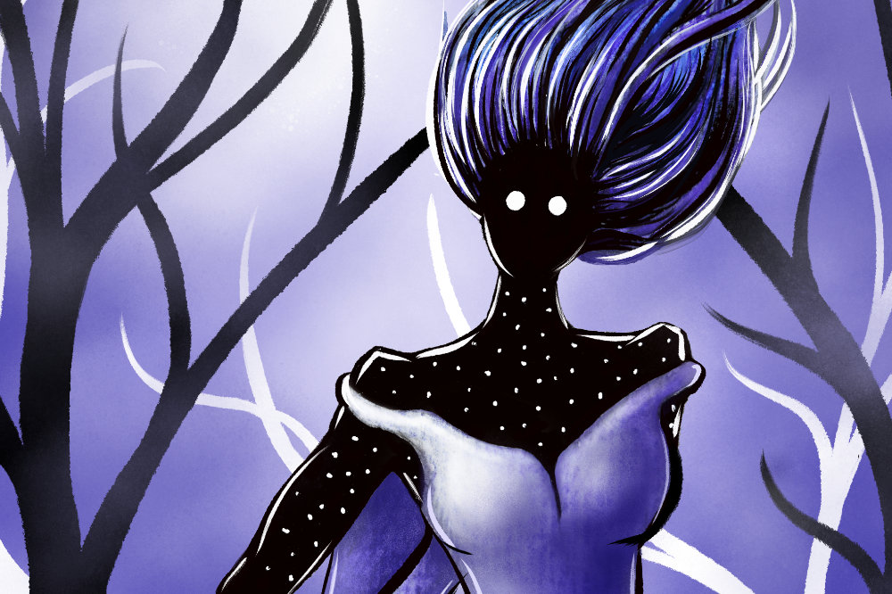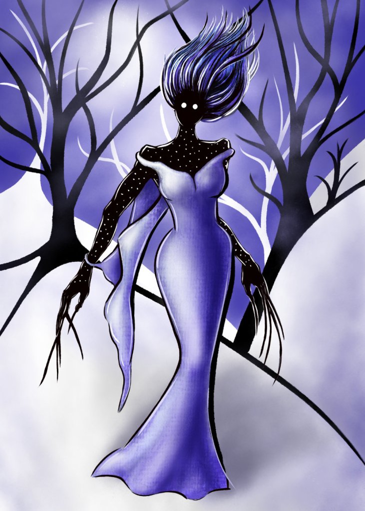 This creation of mine is a creepy and surreal illustration of a monster creature resembling a woman with black skin, glowing eyes and deformed hands with very long nails, wearing a beautiful violet dress in a moonlit, snowy winter forest with strange trees. This mixed media artwork was created using ink, watercolor, and digital art techniques, and the result is an eerie and fascinating image that draws the viewer in.