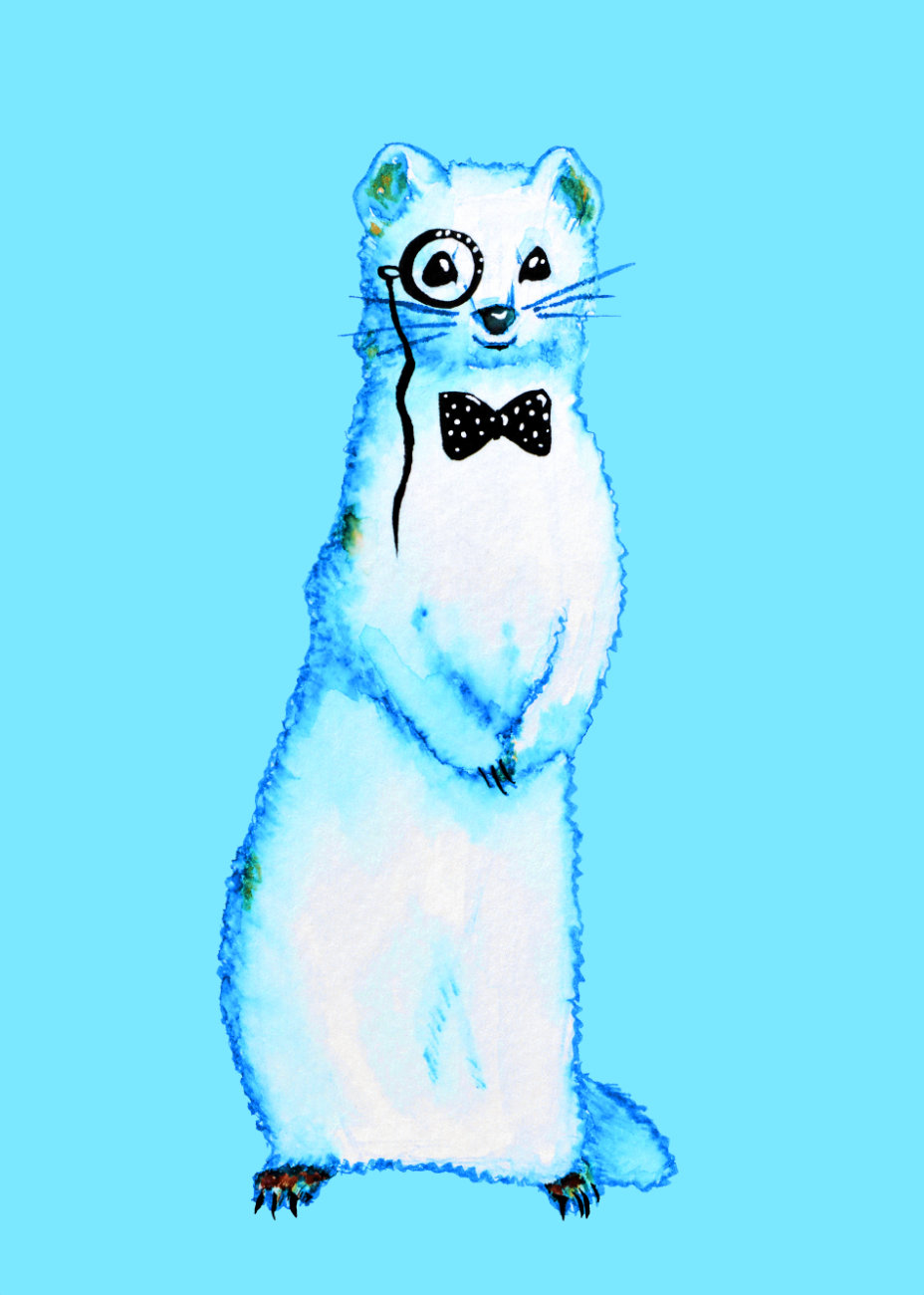 Today, I want to present one of my watercolor artworks which features a cute ferret wearing a necktie and a monocle, set against a minimalist blue background.