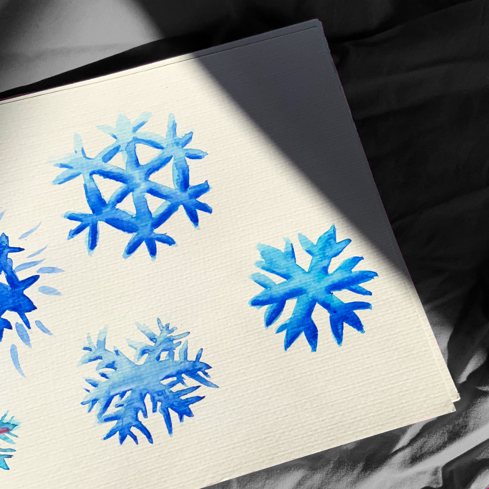 Snowflakes have always fascinated me. Beautiful geometric designs created by the greatest artist that could exist – nature. As it is winter now, I want to present one of my snow inspired designs. It features three lovely snowflake types with uneven shapes loosely drawn in blue watercolor. Made a pattern design with them by tiling an imaginary triangle with the flakes at the place of its points. Here is the finished pattern: