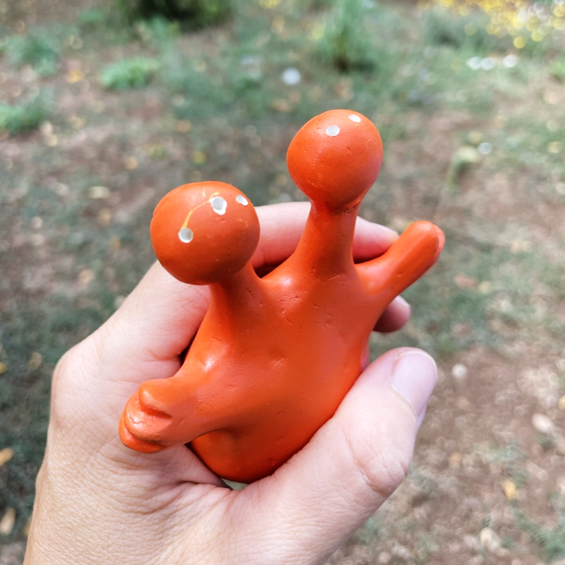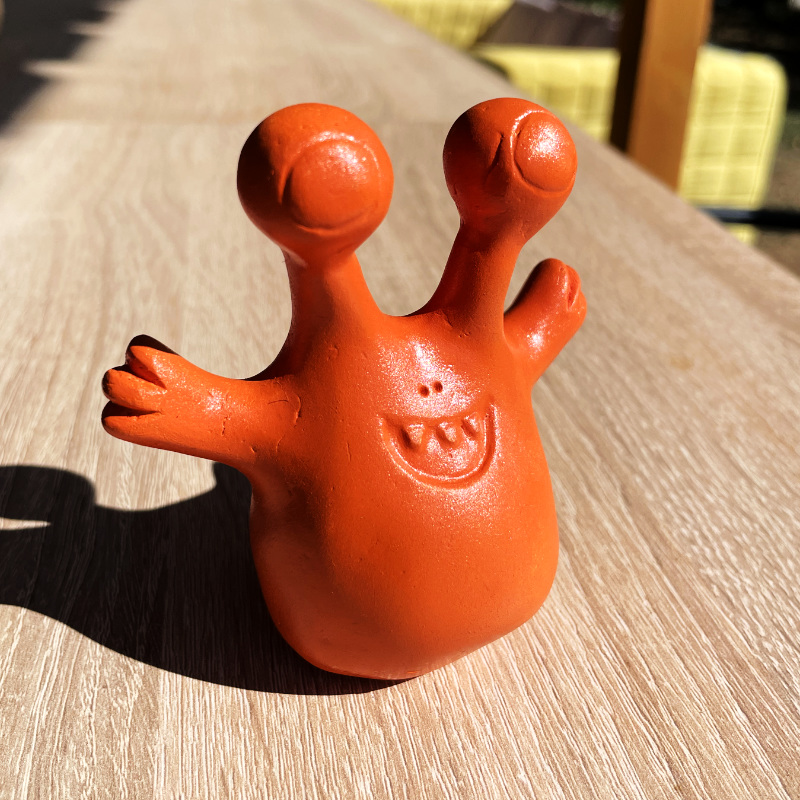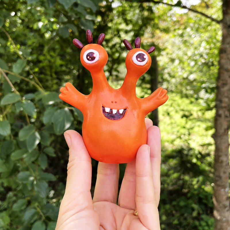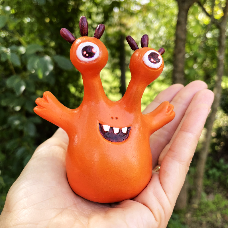 cute orange monster clay figurine with big eyes, fun eyelashes and a smile with big teeth showing with its hands wide open, ready for a hug. crafted by Boriana Giormova, Sofia, Bulgaria