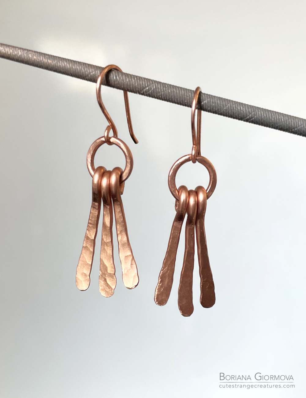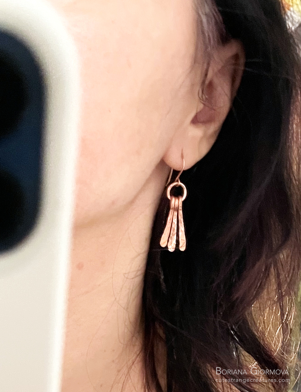 I peeled off the insulation from the leftover copper wire and worked it into the perfect little shapes for earrings. Each one has three hanging elements, making them sway and catch the light just right. There’s something about the hammered texture of copper that I love—it’s rustic yet shiny at the same time. Plus, it’s quite the imperfection so they’re totally one-of-a-kind. 😉