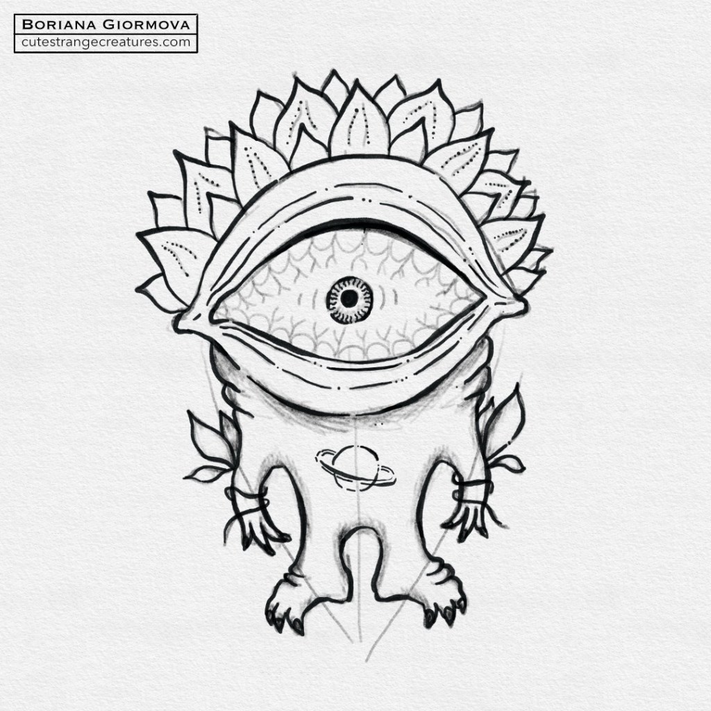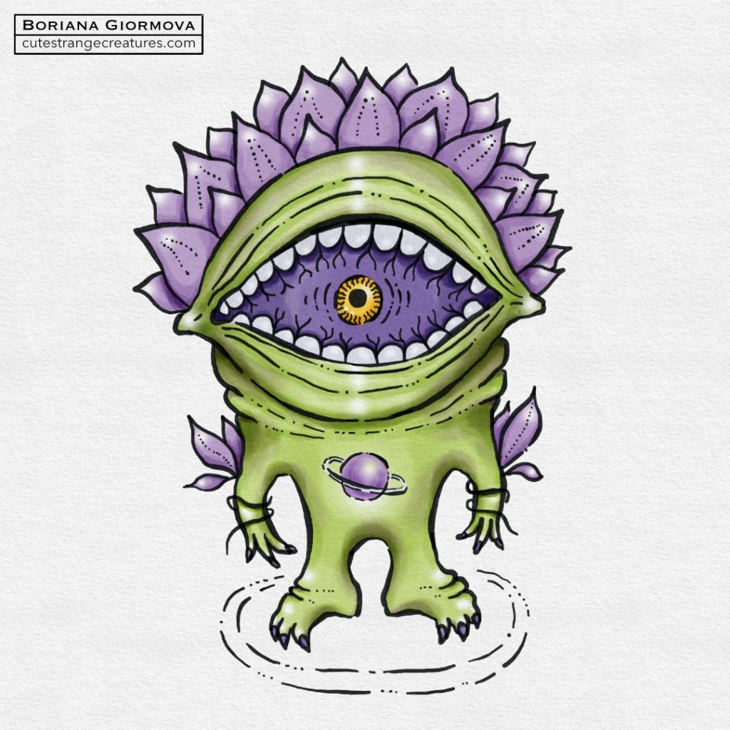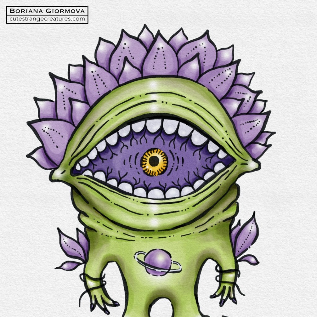 It might sound a little odd, but the inspiration for this character came from my recent tough bout with bronchitis. There were moments when the coughing got so intense that, lying in a dark room, with every coughing fit I saw glowing shapes at the upper and lower rim of my visual field – kind of like the teeth on the alien’s eye. I thought this was a very interesting experience, so I grabbed my electronic pencil and started sketching what I saw. And, as with most of my art, this quirky and cosmic creature just naturally came to life. It’s funny how even the roughest moments can spark a little creativity!