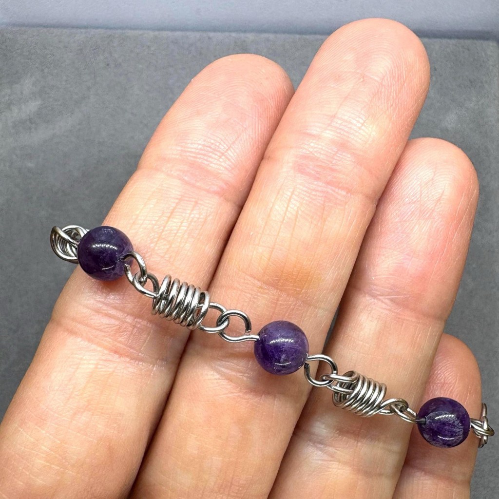 This bracelet is entirely handmade using 6 mm natural amethyst gemstones and 304 stainless steel wire. Why stainless steel? It’s a durable, hypoallergenic (for most people) material that resists tarnish, making it perfect for jewelry that’s meant to last.