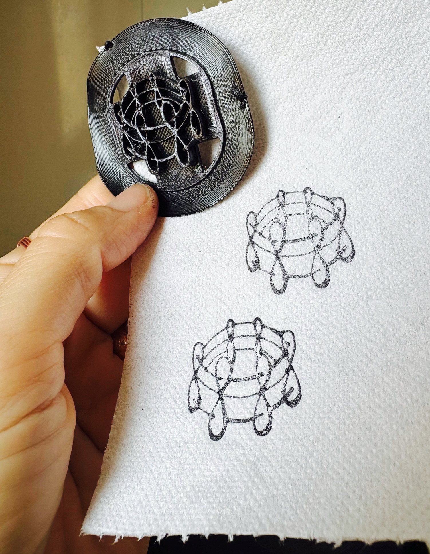 Testing it with different inks, I experimented with various surfaces and unexpectedly found that … hm… toilet paper worked exceptionally well for block printing. The texture and absorbency created crisp, detailed impressions of the molecule, adding an organic feel to the structured chemical design.