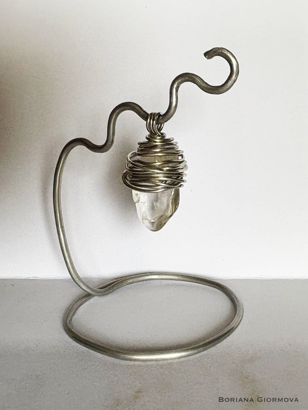 Then I wondered what to do with it because I find it hard to wear necklaces. So I took a piece of 12 gauge aluminum wire and bent it into a simple frame. Then hung the wire wrapped crystal on the frame, and just like that, this tiny, “useless” creation was born.