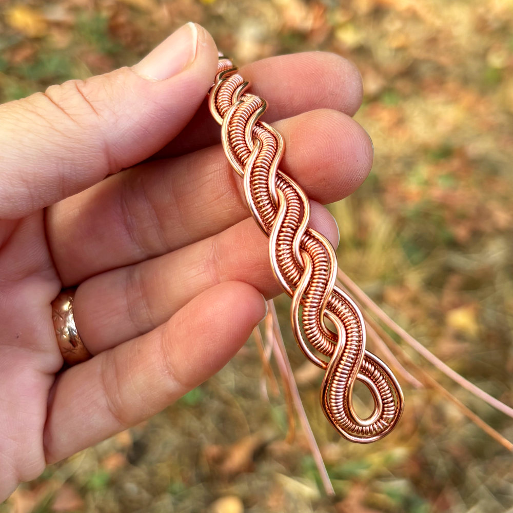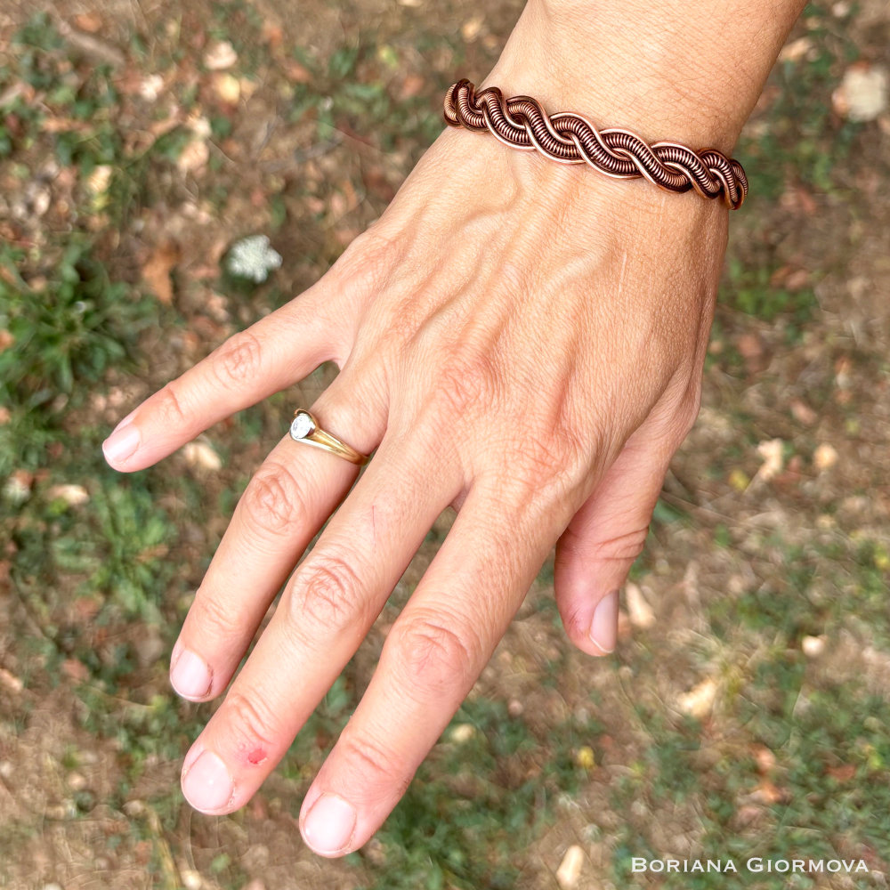 Here’s a chunky braided copper cuff which I crafted last summer. It is naturally oxidized in warm chocolate-y copper tones. I crafted this bracelet using recycled copper wire.