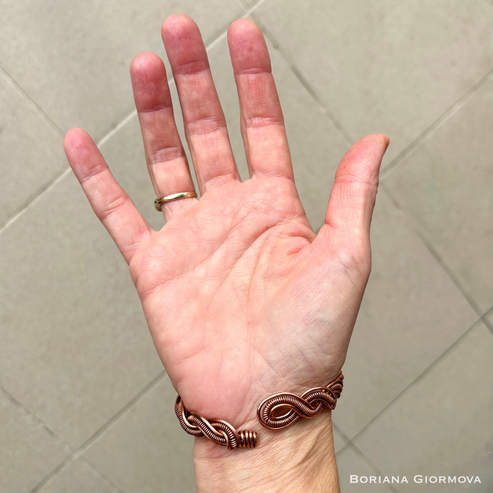 The finishing was hard. I put it the wire structure around a small cylindrical glass to shape it. Then I made a clasp. Day after day I looked at the bracelet and the clasp was just nagging me. I didn’t like it at all. So I got my jeweler’s saw and just cut the end to which the clasp was connected. It was a relief – now I was okay with this tortured piece of jewelry. Filed a lot, polished a lot. Then left for many many days until natural patina appeared. (Franky, I actually forgot about the cuff for some time, but the former sentence sounds more professional.) Lastly I put some layers of Renaissance wax to simultaneously protect and allow the warm brown color to further develop with the aging of copper. Here is the result: