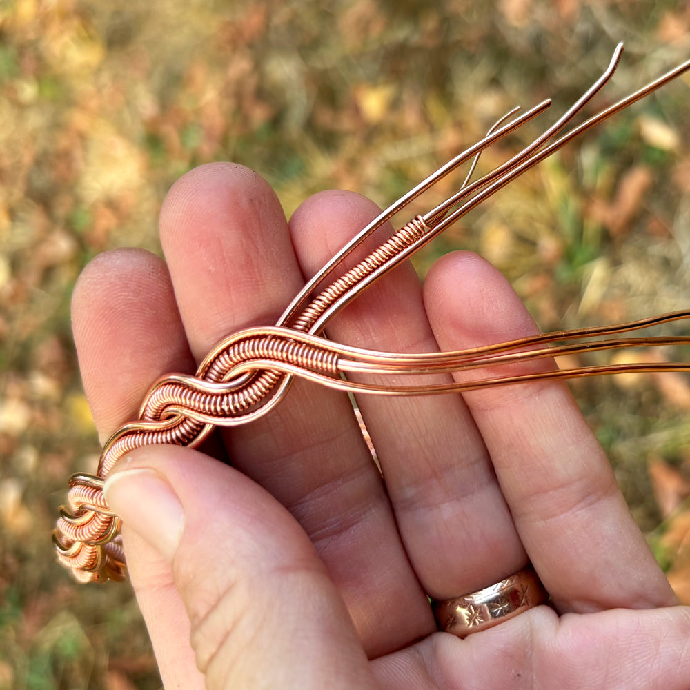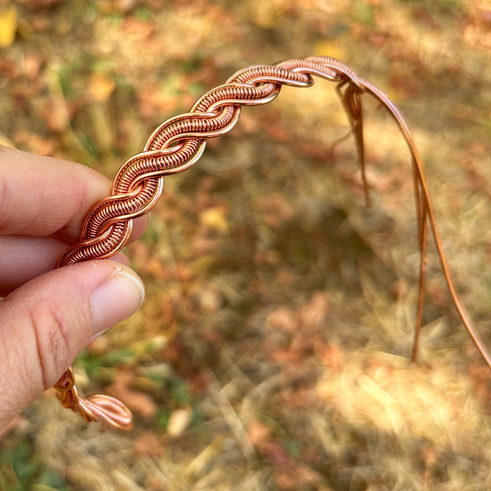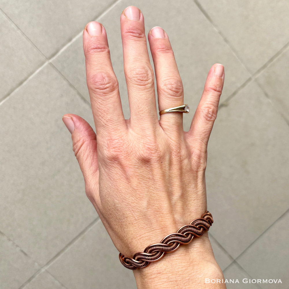 Here’s a chunky braided copper cuff which I crafted last summer. It is naturally oxidized in warm chocolate-y copper tones. I crafted this bracelet using recycled copper wire.