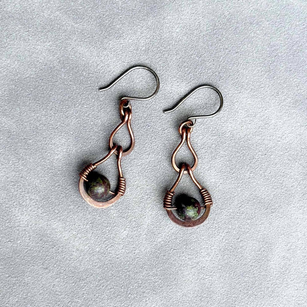 - Камъкът на воина: В центъра на всяка капка е вплетен 6 мм естествен яспис „Драконова кръв“. Този камък е известен със своите наситени зелени нюанси, пресечени от червени жилки, напомнящи легендите за древни създания. Камъкът е внимателно прикрепен с деликатна сребърна тел, която създава изискан контраст на тъмната медна основа.