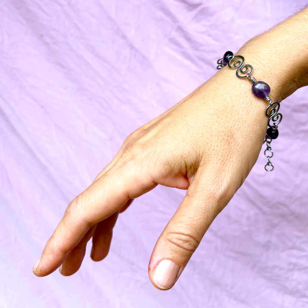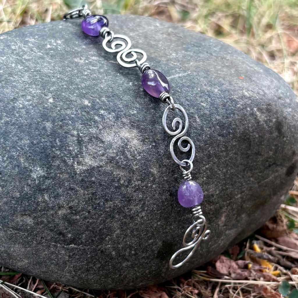 I used stainless steel 304 wire. 18 g (1 mm) for the double spirals and the heart clasp and 22 g (0.6 mm) for wrapping the amethyst stones. Hammered the spirals and the clasp very carefully to achieve this super flat look. And polished the bracelet quite a long time too. Until a mirror shine of the steel. I also made one extension link so that the bracelet is slightly adjustable. The stones are not flawless, they have minor scratches, but they’re intense violet, so very beautiful!