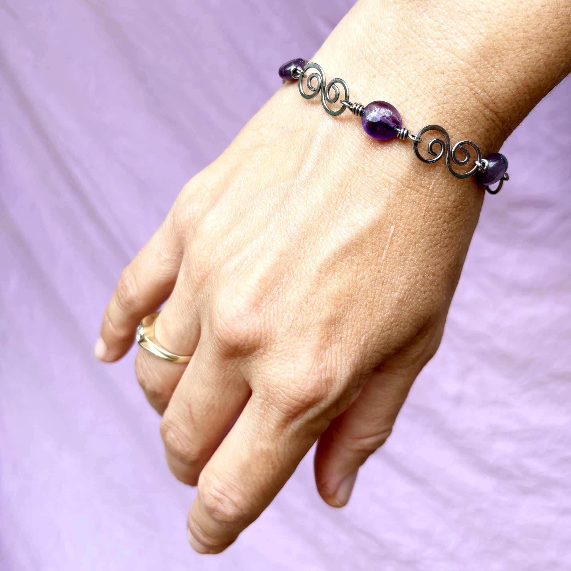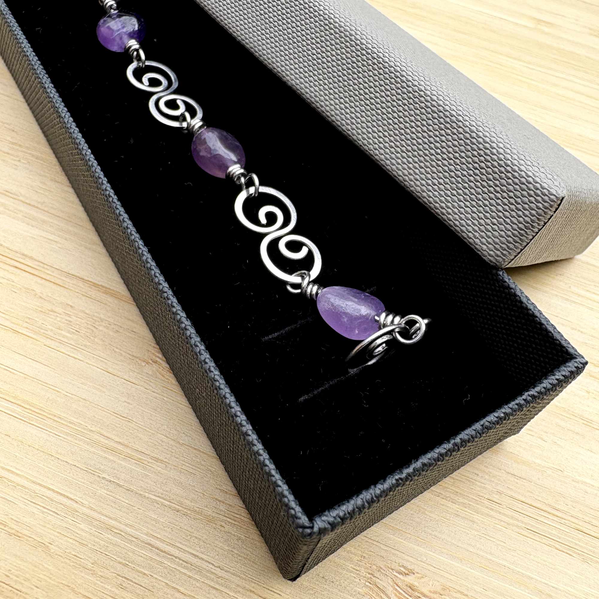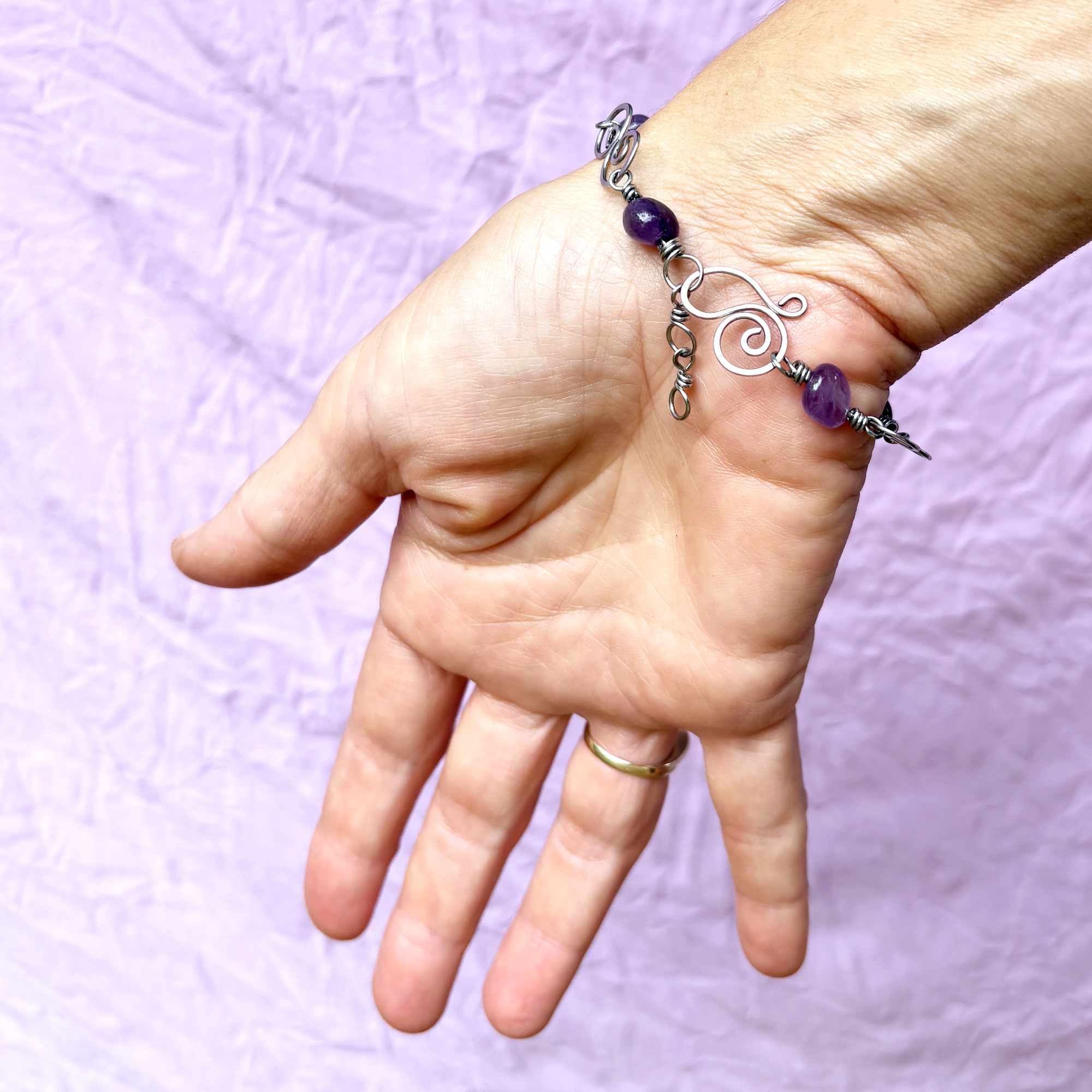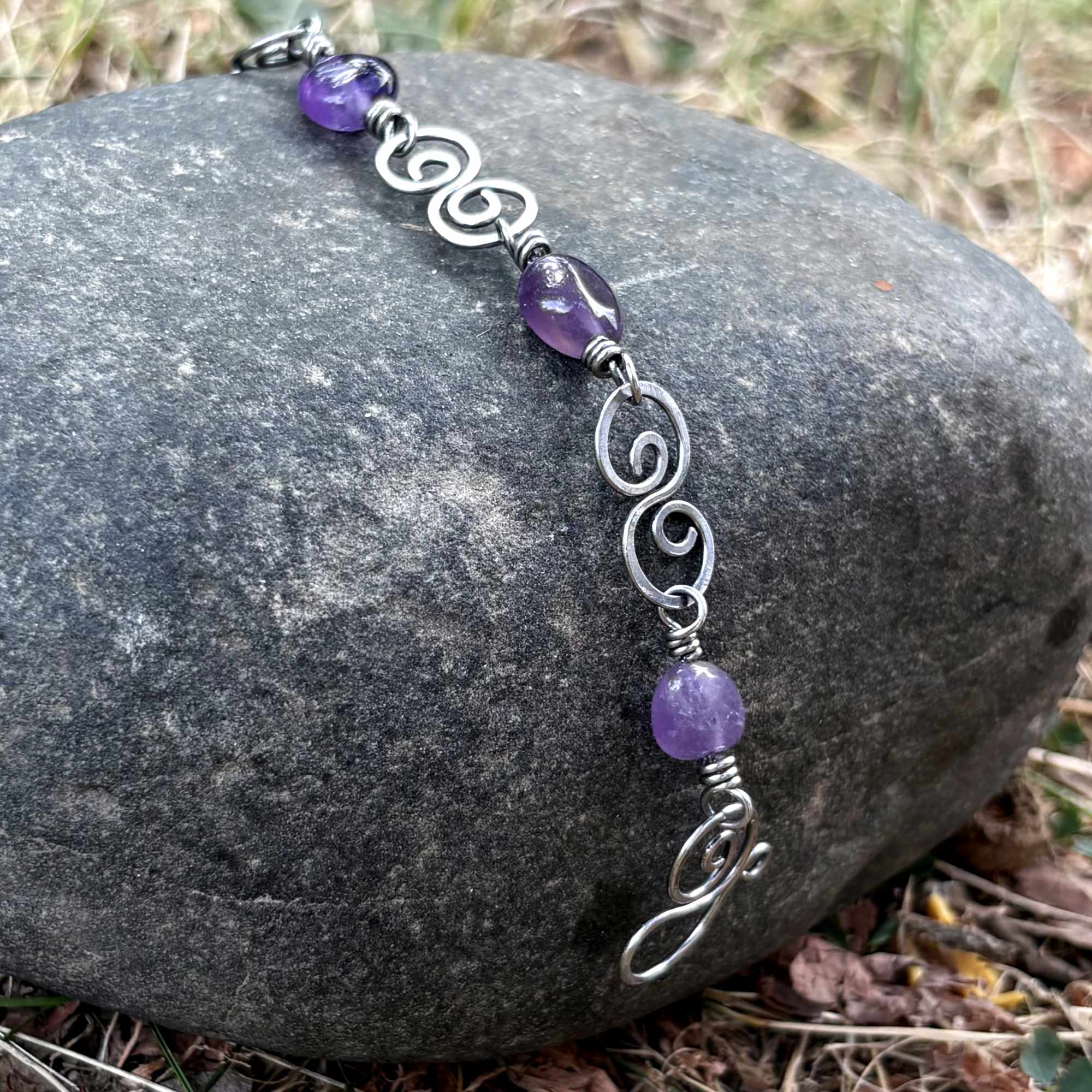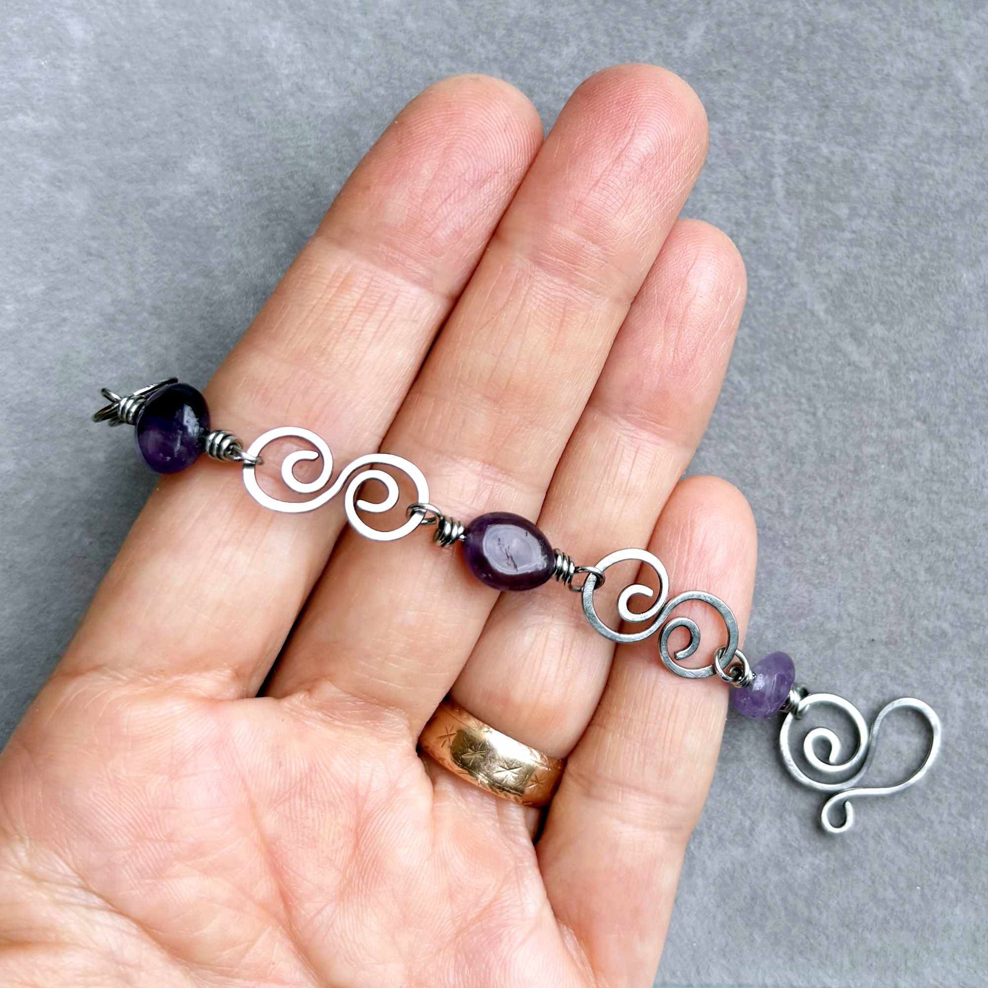 I used stainless steel 304 wire. 18 g (1 mm) for the double spirals and the heart clasp and 22 g (0.6 mm) for wrapping the amethyst stones. Hammered the spirals and the clasp very carefully to achieve this super flat look. And polished the bracelet quite a long time too. Until a mirror shine of the steel. I also made one extension link so that the bracelet is slightly adjustable. The stones are not flawless, they have minor scratches, but they’re intense violet, so very beautiful!