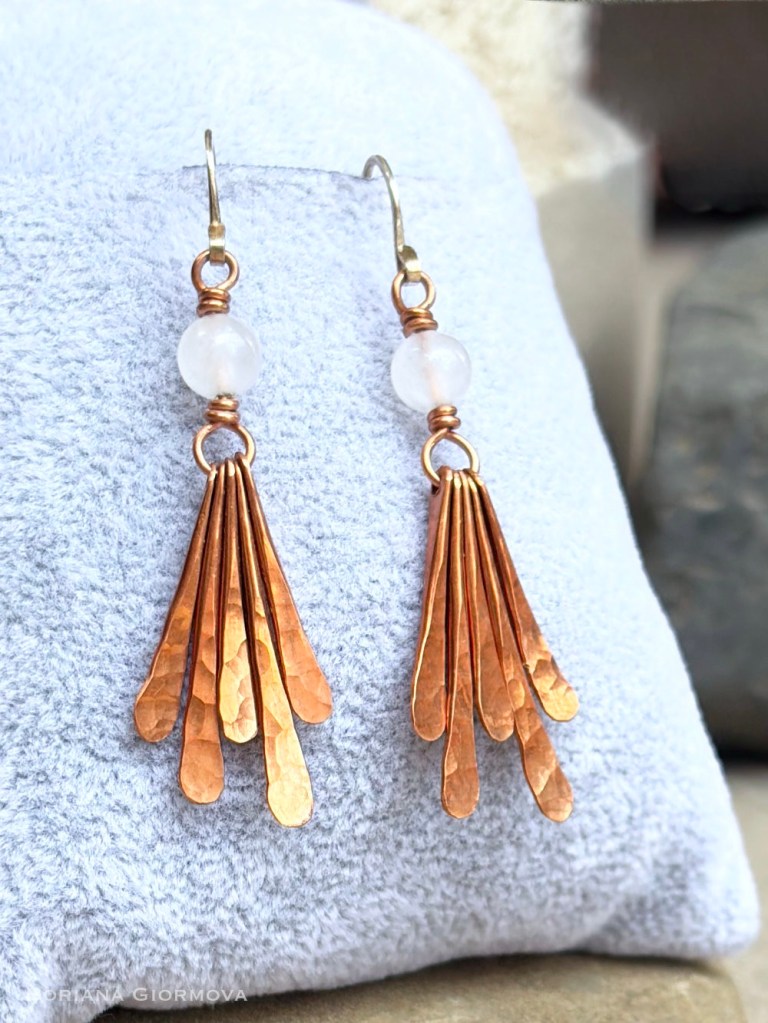 Each has five long heavily hammered copper teardrop elements (hammering is my favorite part). They connect to a copper wire ring which holds the beautiful 6 mm translucent white natural moonstone. You can see its unique light effect – adularescence – in the photo. It is more pronounced in one of the gemstones but it’s the magic of nature – no two are exactly the same. The whole stucture is connected to sterling silver earwires.