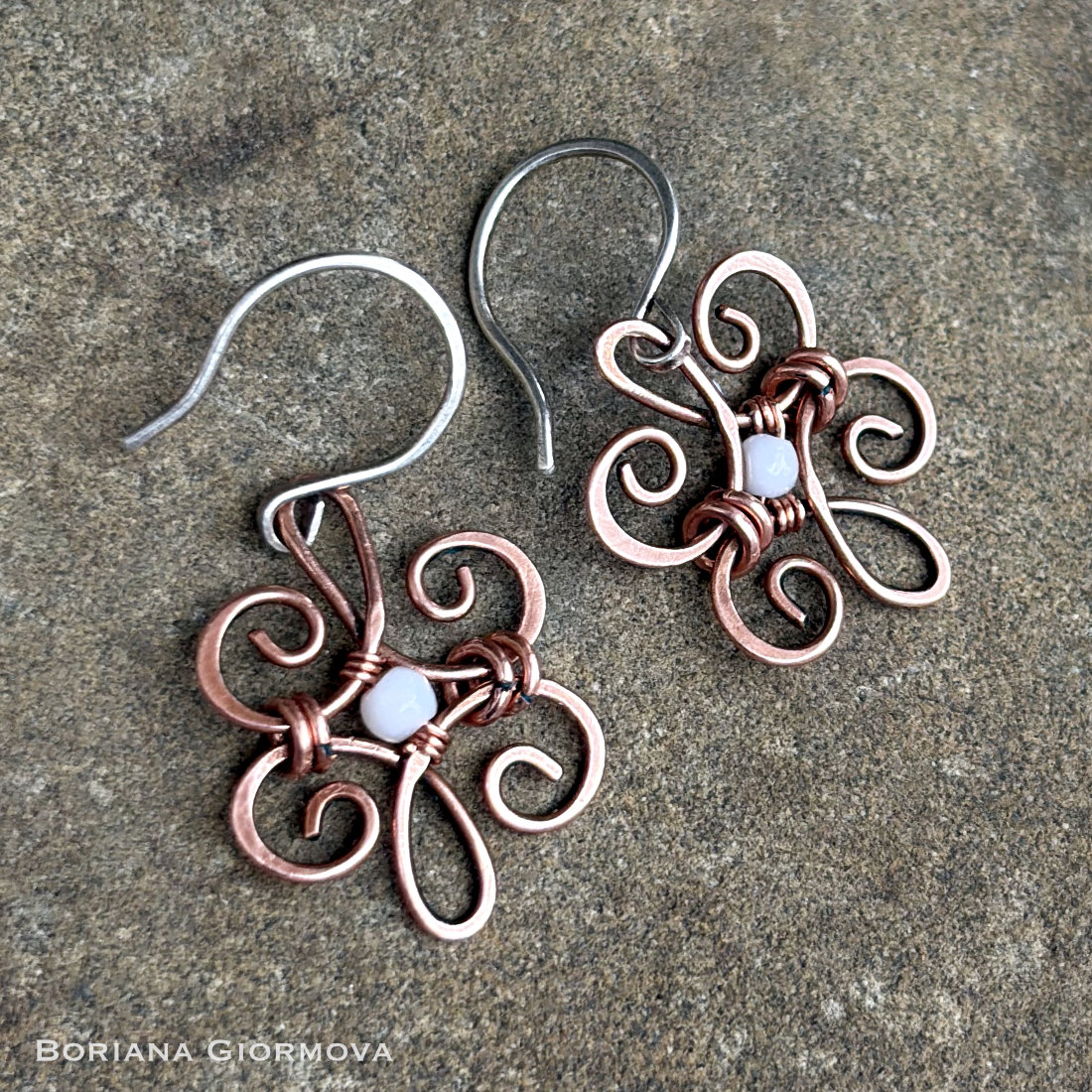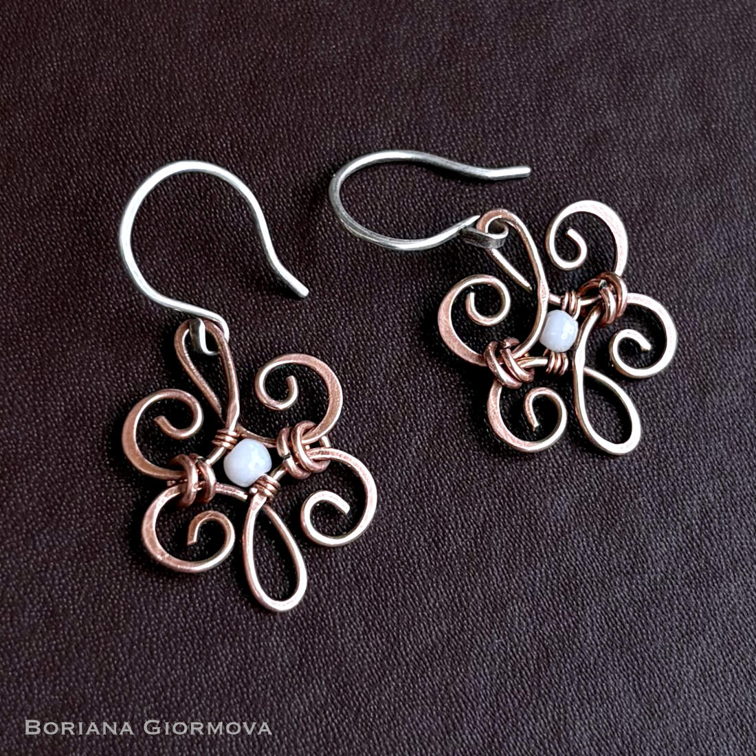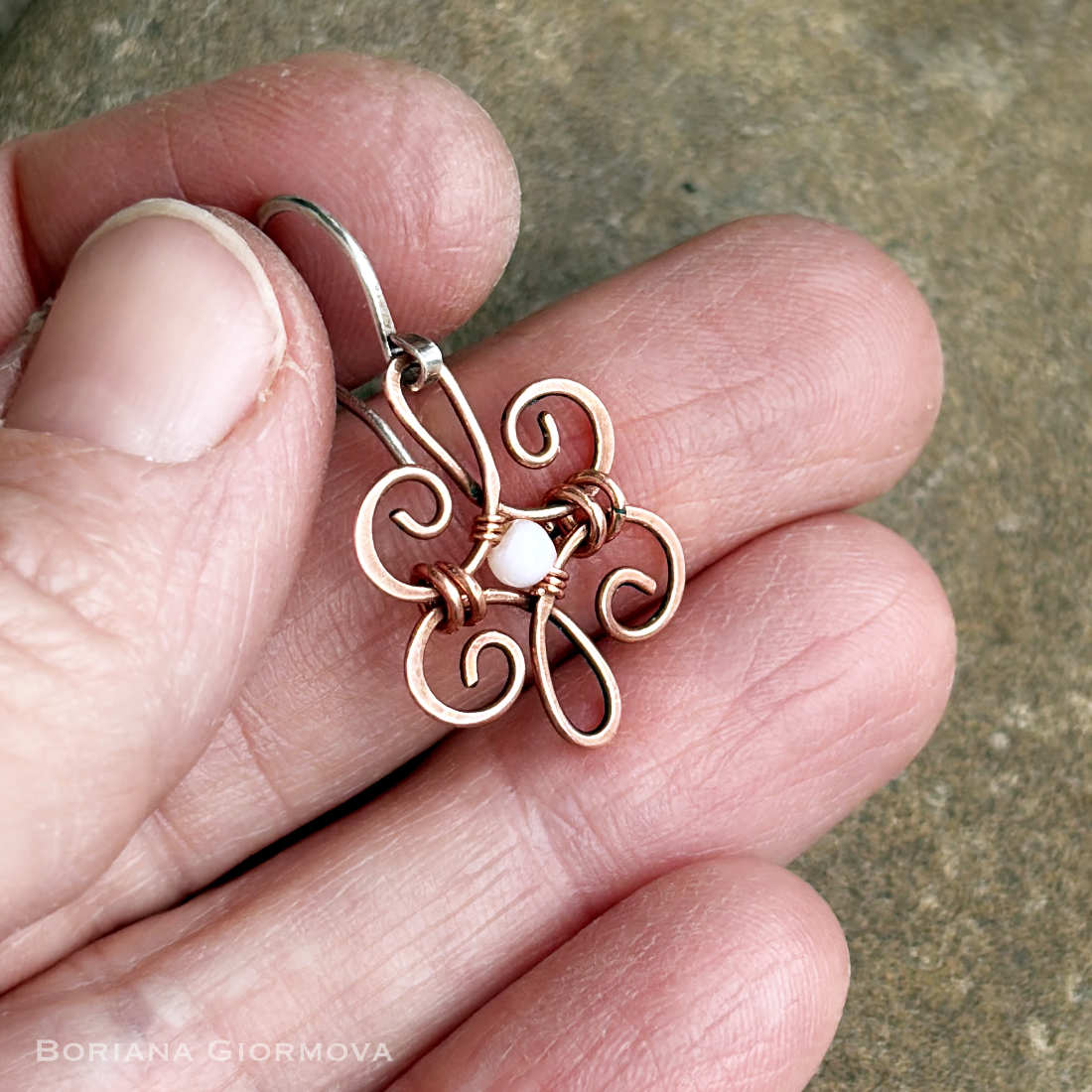 I made these lightweight copper earrings in boho style for myself and added tiny and lovely mother of pearl beads. 🙂