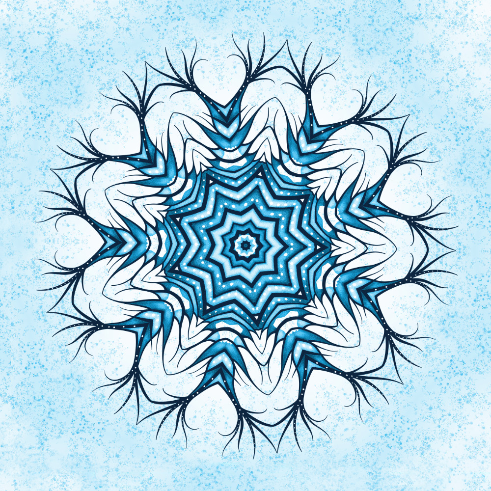 Quirky snowflake artwork with fun details and dots in a dreamy blue palette against a textured snowy background. Drawn by Boriana Giormova.