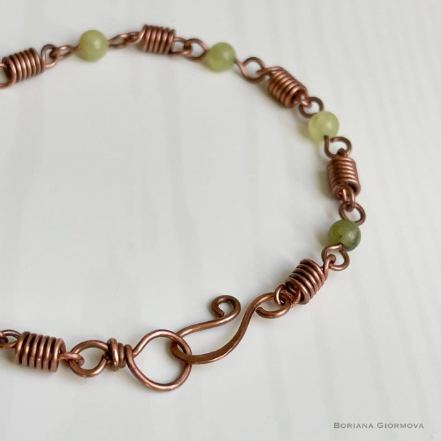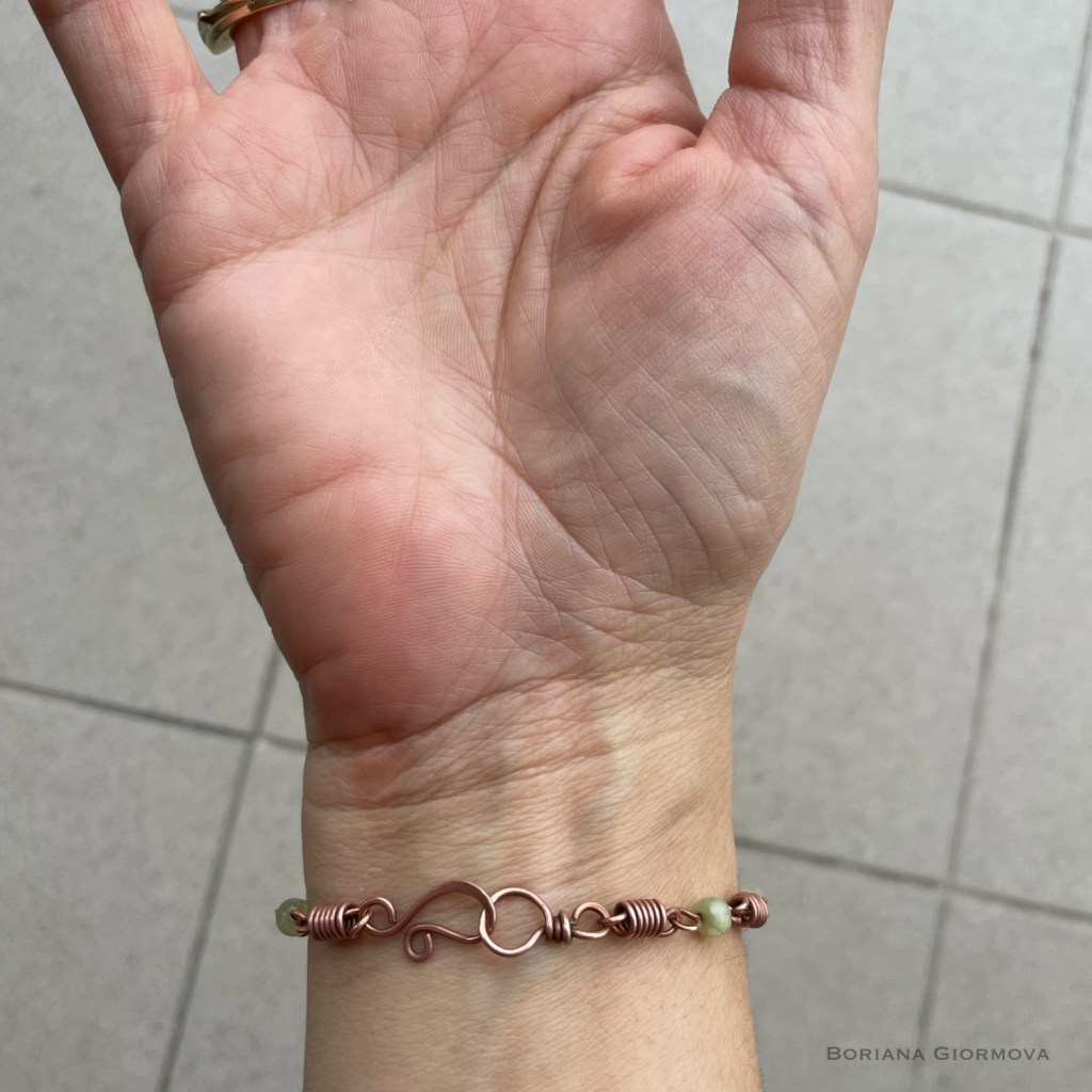 Then, there’s the jadeite. Those little green jadeite beads (4 mm) add a pop of color and some good vibes, too. Jadeite is often associated with peace and balance, so it’s not just pretty – it’s meaningful. The combination of copper and jadeite makes this bracelet feel both simple and special, perfect for wearing every day or dressing up for an occasion.