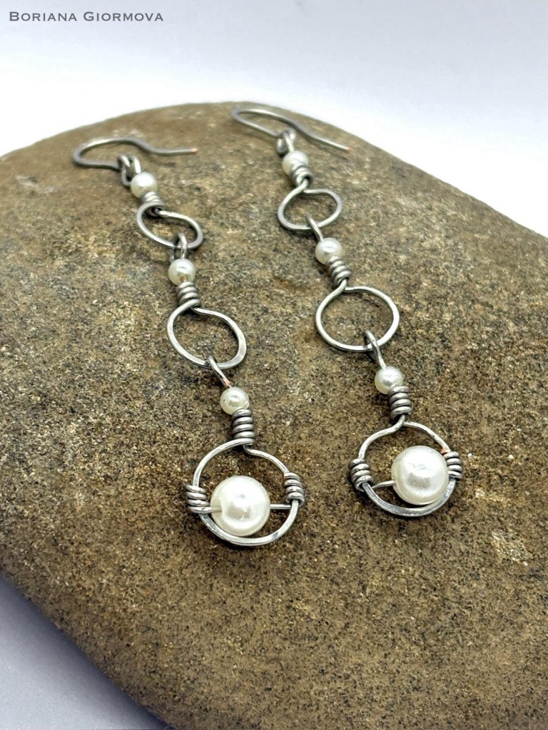 Над всяка халка има нежни мъниста с форма на перла, които добавят елегантен акцент. На най-голямата халка, разположена в долната част, е поставено по-голямо мънисто с форма на перла, което придава завършеност на дизайна.
