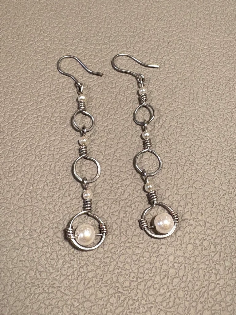 Обеците са направени от висококачествена медна тел със сребрист цвят, която не избледнява. Всяка обеца се състои от три брънки с форма на халка с увеличаващ се размер отгоре надолу.