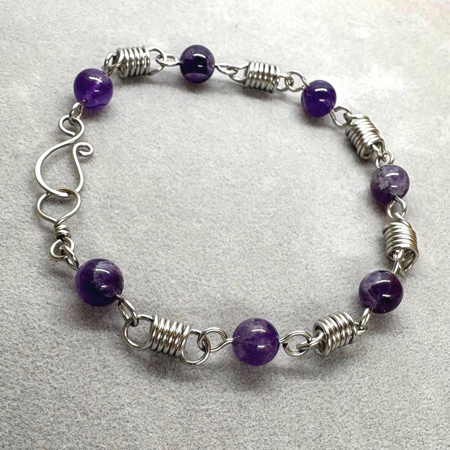 This Handmade Amethyst Bracelet combines artistry, individuality, and meaningful gemstone properties. Amethyst, known for its calming effects, is connected to durable stainless steel wire coils and clasp. Each bracelet is unique, ideal as a thoughtful gift for any occasion, supporting small businesses and celebrating handmade craftsmanship. Explore more in the Etsy shop.